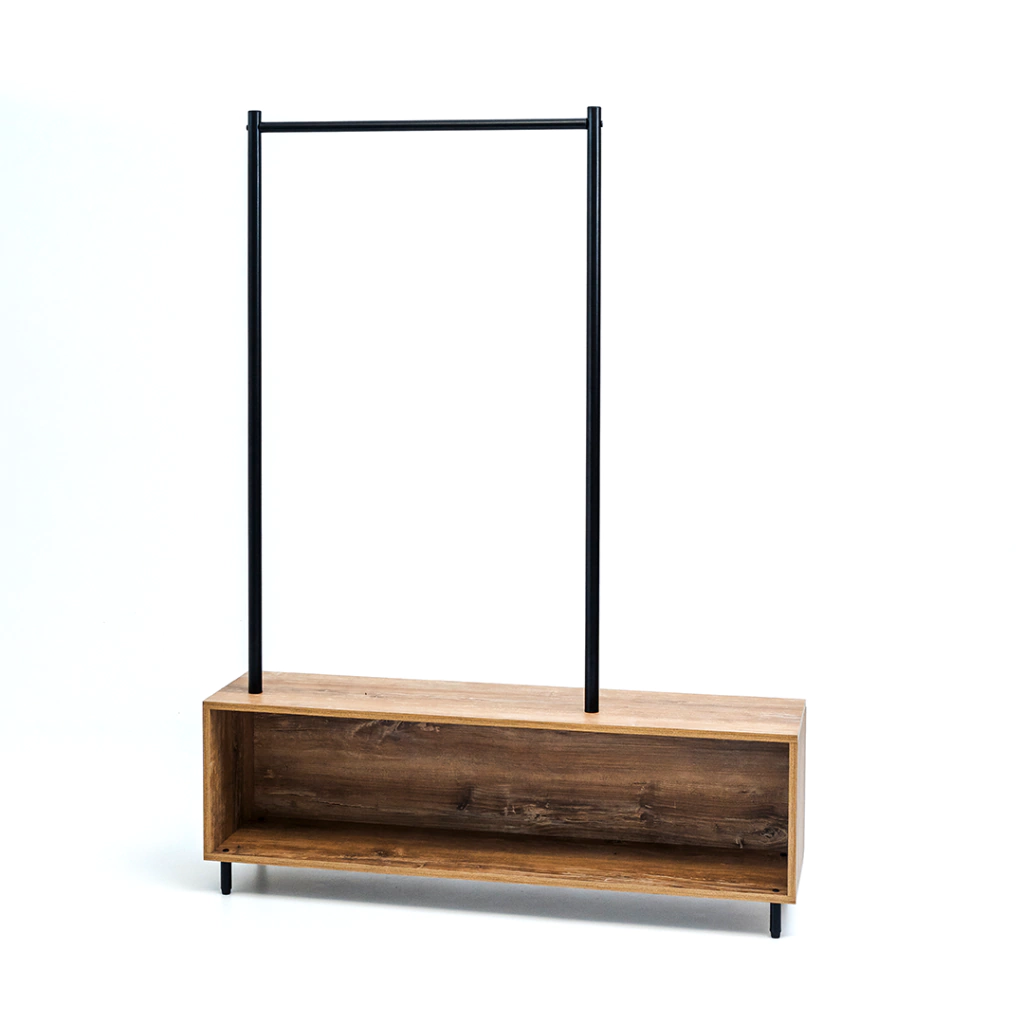 El perchero M01 combina líneas simples y materiales resistentes en un diseño versátil que se adapta a cualquier espacio. Cuenta con una barra superior para colgar tus prendas favoritas y una base inferior amplia ideal para guardar calzado, bolsos o cajas de organización.
