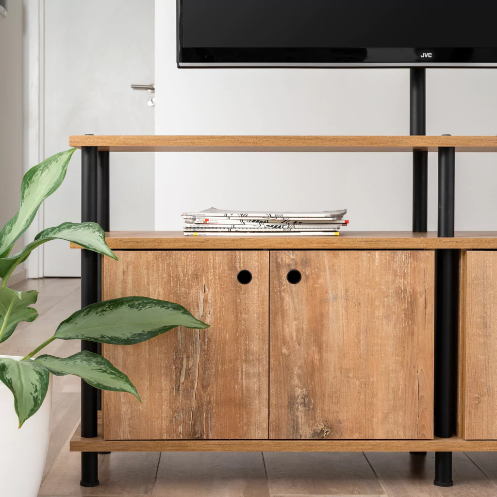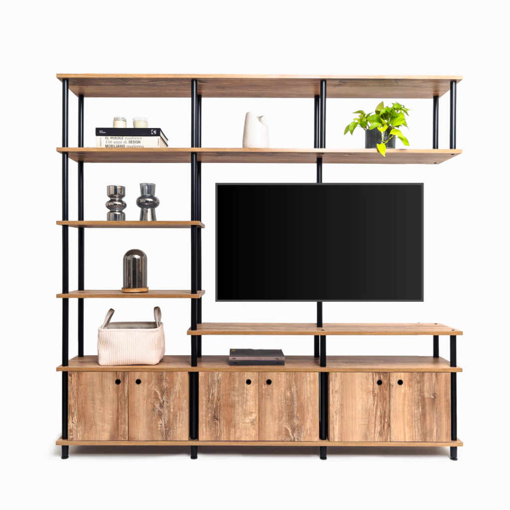 Transformá tu espacio con nuestro separador de ambientes de 3 cuerpos. Este diseño moderno, construido con siete niveles de apoyo, 3 módulos adicionales con puertas y estantes. Ofrece un soporte exclusivo y giratorio, ideal para un televisor de hasta 50″ (tener en cuenta al tomar las medidas el marco de la tv).